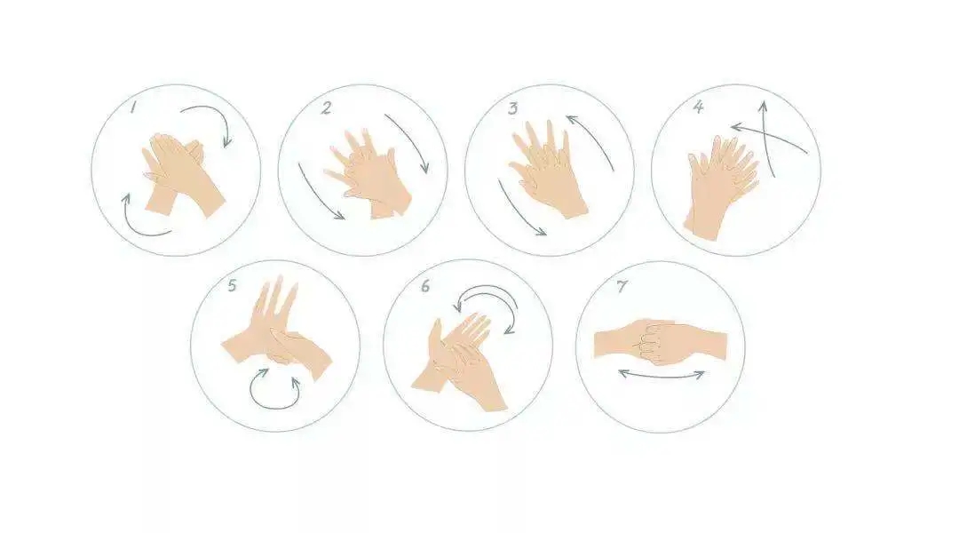 02保持手部衛(wèi)生。接觸公共環(huán)境或公共用品后,用肥皂或洗手液,采用七步洗手法搓洗,流水沖凈。如沒有洗手設施,可使用含有70%至80%的酒精搓手液(免洗洗手液)潔凈雙手。