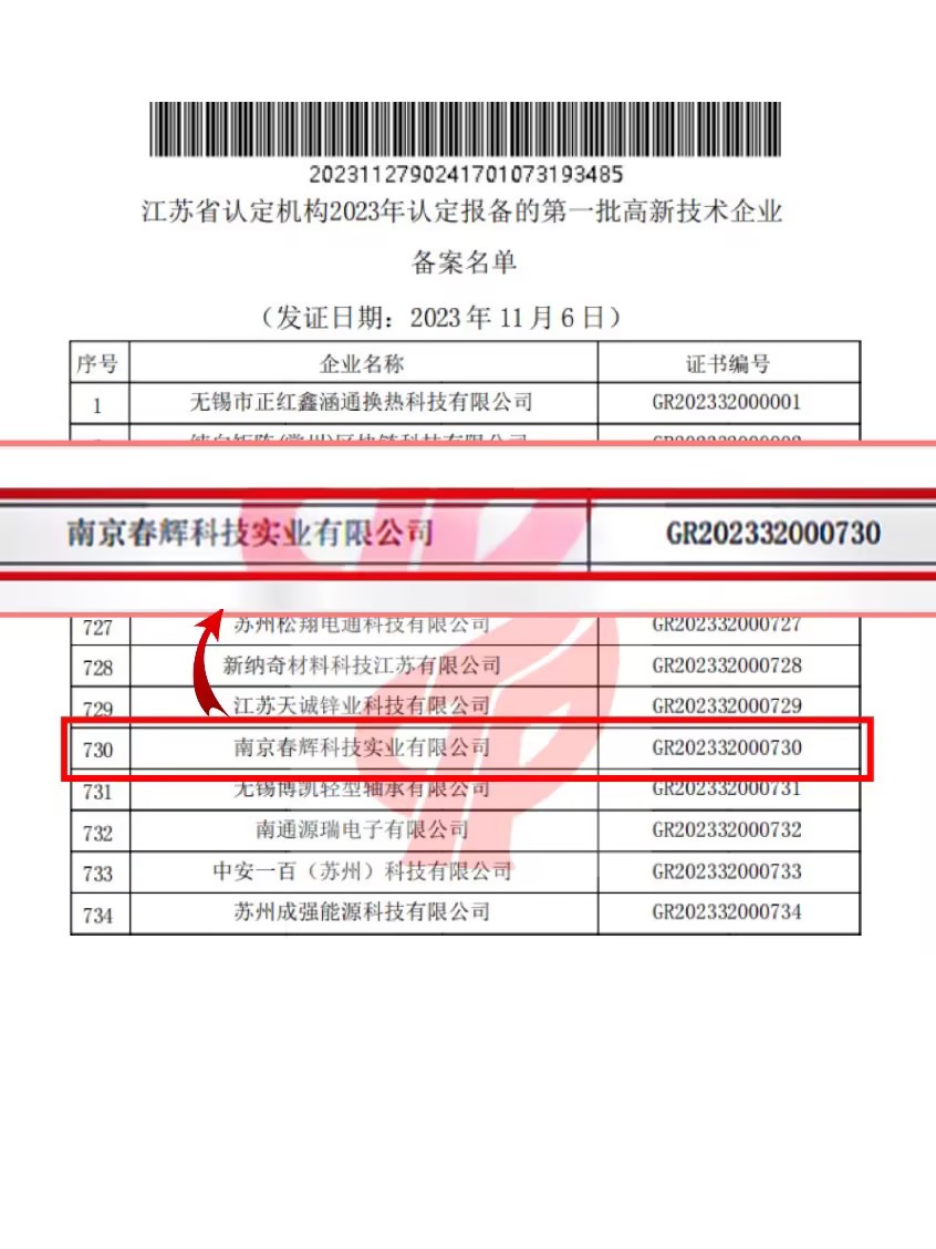 11月27日,根據(jù)《高新技術(shù)企業(yè)認(rèn)定管理辦法》和《高新技術(shù)企業(yè)認(rèn)定管理工作指引》有關(guān)規(guī)定,全國高新技術(shù)企業(yè)認(rèn)定管理工作領(lǐng)導(dǎo)小組辦公室發(fā)布了江蘇省認(rèn)定機構(gòu)2023年認(rèn)定報備的第一批高新技術(shù)企業(yè)名單,春輝公司順利通過復(fù)審認(rèn)定,再次被授予國家高新技術(shù)企業(yè)稱號。