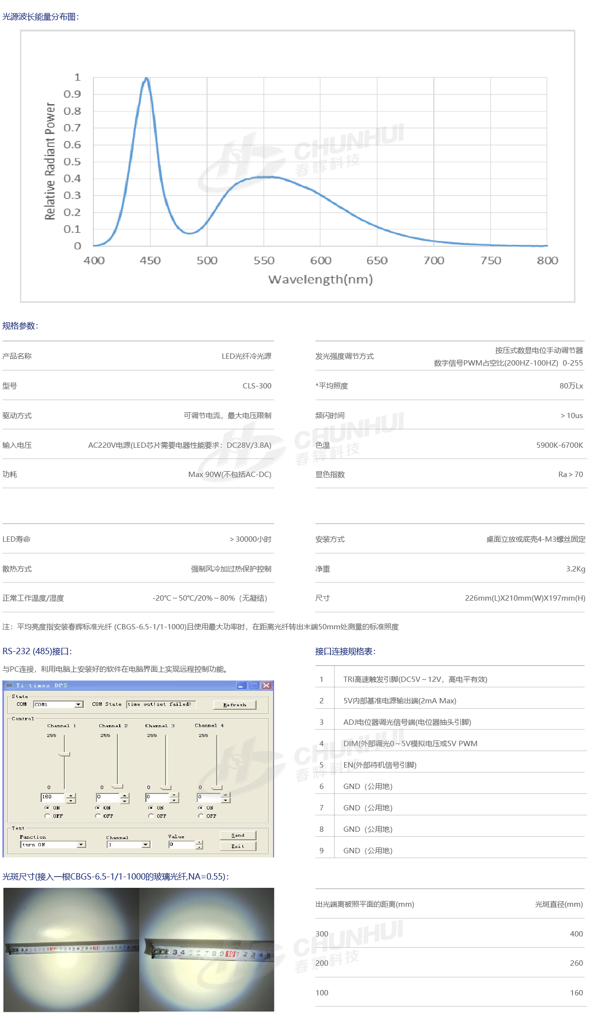 采用超大功率LED芯片,是一款高亮度的LED冷光源,實現超過300W金鹵燈光源的光輸出;支持快速觸發功能,響應時間5us,顯色指數70 / 90可選;重量輕,功率高,色溫高,顯色性好,能效高,性能穩定,噪聲小,壽命長,外型美觀、精巧,便于安裝,手動調節或實行RS-232(D89)接口遠程控制,可聯機實現同步控制,可提供多種光纖輸出接口;廣泛用于醫療,光學,工業,科研等領域。